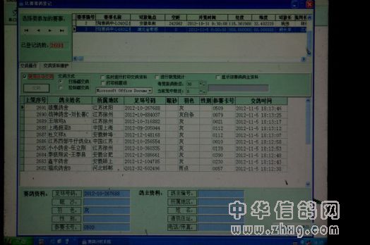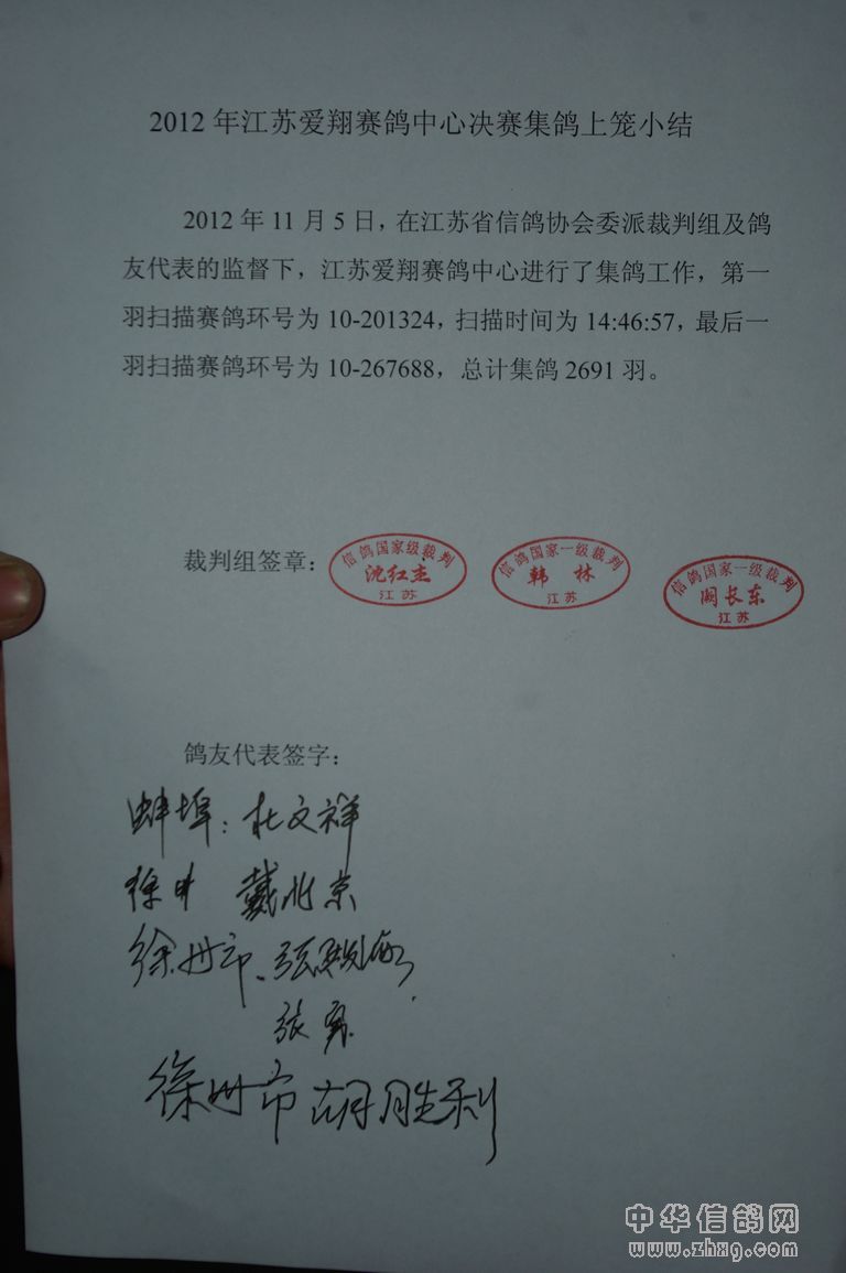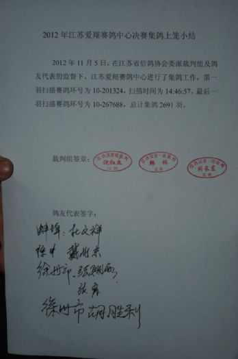 国家级裁判:沈红杰同志,国家一级裁判:阙长东同志、国家一级裁判:韩林同志对集鸽单进行签字盖章