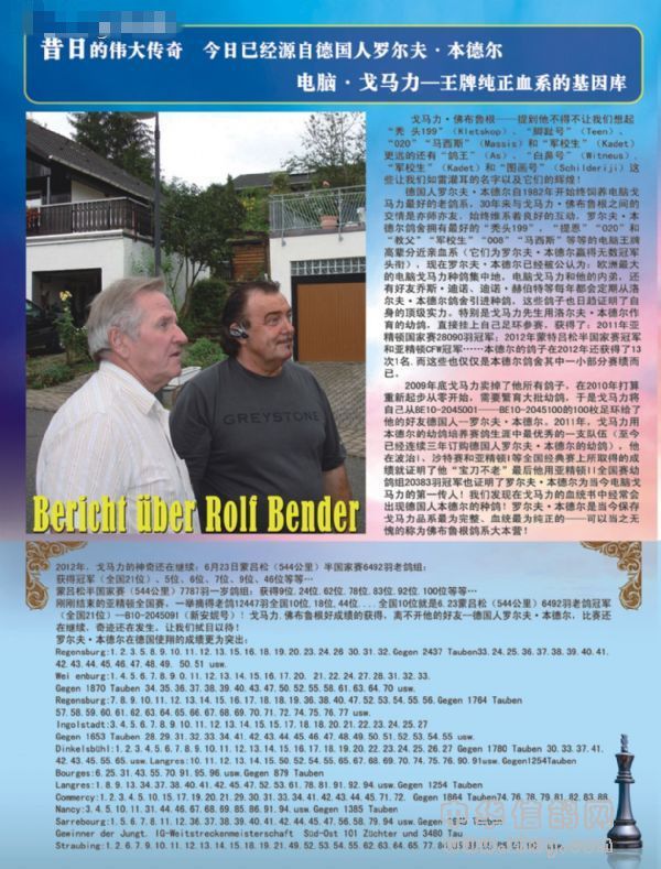 德国人罗尔夫·本德尔自1982年开始终饲养电脑戈马力的老鸽系, 30年来与戈马力.佛布鲁根之间的交情是亦师亦友,始终维系着良好的互动,罗尔夫•本德尔鸽舍拥有的“秃头199”,“提 恩”,“020”和“教父”“军校生”“008” “马西斯”等等的电脑王牌高辈分近亲血系(它们为罗尔夫•本德尔赢得无数冠军头衔),现在电脑戈马力和他的内弟,还有好友乔斯.迪诺、迪诺.赫伯特等每年都会定期从洛尔夫.本德尔鸽舍引进种鸽,这些鸽子也日趋证明了自身的顶级实力。特别是戈马力先生用洛尔夫.本德尔作育的幼鸽,直接挂上自己足环参赛,获得了:2011年亚精顿国家赛28090羽冠军;2012年蒙特吕松半国家赛冠军和亚精顿CFW冠军……本德尔的鸽子在2012年还获得了13次1名,而这些也仅仅是本德尔鸽舍其中一小部分赛绩而已。