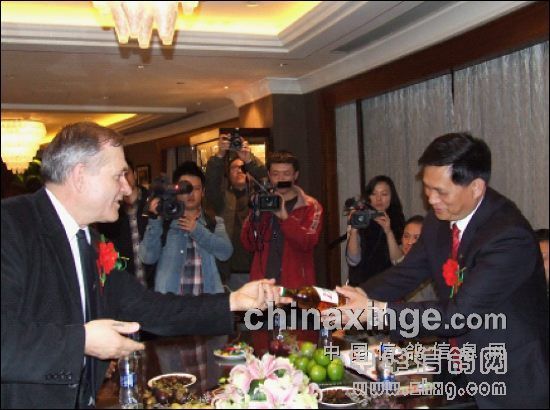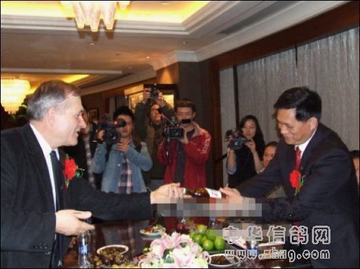 国际鸽联第一副主席、匈牙利信鸽协会主席伊斯特凡·巴窦斯先生向胡德春主席赠送礼品