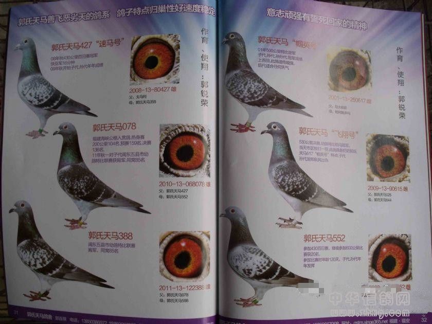 1999年到2002年先后引进杨阿腾、杨阿腾多利、马太依斯、司翠克鲍特、凡布利安娜、曼德斯詹森、恒得利、萧山雄等。再加上后期引进的戈马利。鸽舍以马太依斯配对杨阿腾多利的子代母鸽“帼英号”郭氏天马617亚军做为基础中心,经过十几年的赛飞和远交近配的育种检验,已形成一路品系的特征!在本地,公棚还是在鸽友处入赏率极高!鸽子的特点:耐力顽强,具有不死必归精神。在风雨大雾恶劣天里表现异常出色,好天气也快!鸽友在鸽子的饲养上属于自然粗养式,赛鸽种鸽保姆鸽都养在一起。早上喂1-5分饱,下午7-10分(看鸽子的状态给予多或少)。比赛上基本都用饲料供应法、配对争偶、占巢法来调理鸽子的比赛归巢积极性!