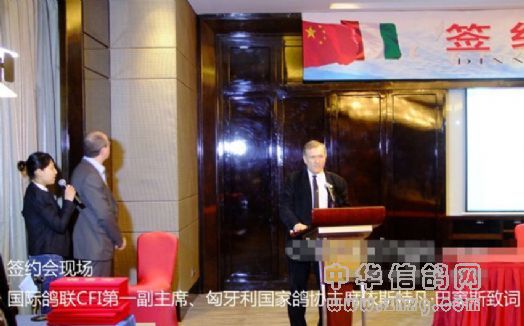 赞助企业的代表及国际鸽联第一副主席、匈牙利信鸽协会主席巴窦斯先生出席此次签约仪式。巴窦斯先生在致辞中提到:“中国和匈牙利互为友好国家,中匈两国的领导人曾多次互访,相信今天的这一活动将进一步促进中匈两国人民和鸽友之间的友谊,对中国鸽友的大力支持表示衷心感谢!”