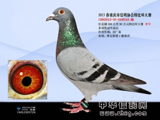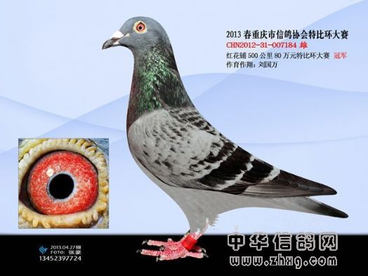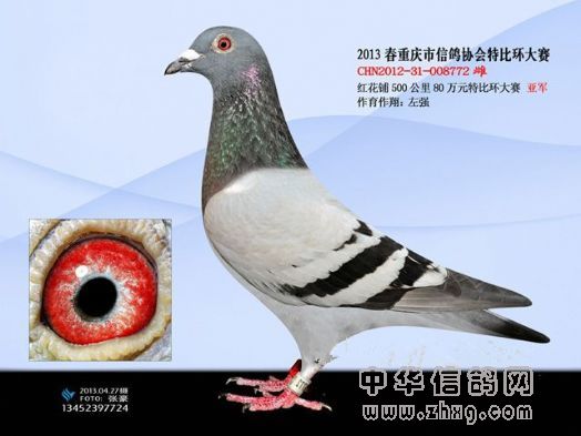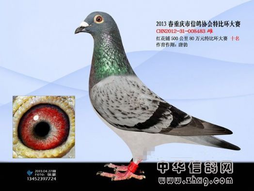 2013年重庆市信鸽协会春季特比环保底80万元大奖赛于4月23日早上7点30分在陕西红花铺放飞,比赛共计集鸽1509羽。当天下午16点30分左右见鸽归巢,截至当晚21点,有效报到赛鸽73羽,其中优胜杯(650元/枚)报到25羽,精英杯(1000元/枚)报到7羽。