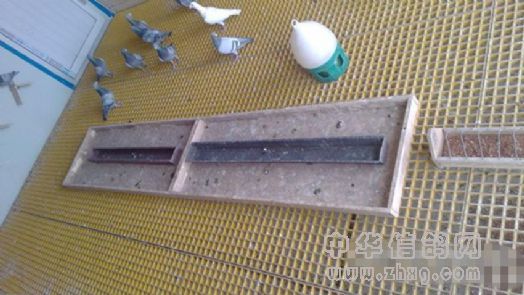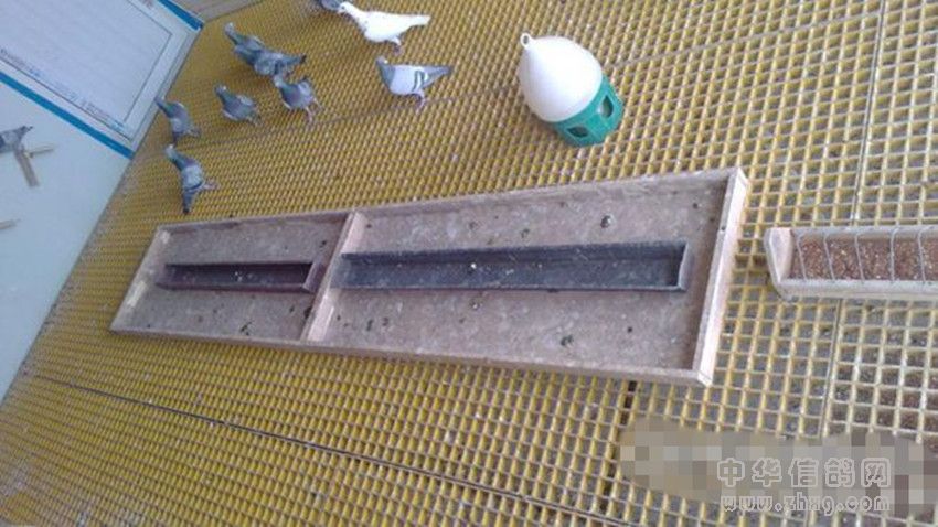 尼龙网格的使用,便于保持卫生,但也增加了饲料的损失。为了节约鸽粮,防止浪费,邱文先生在食槽下面加了一个托盘,使鸽子吃食时叨出来的粮食不至于落到地网下面。