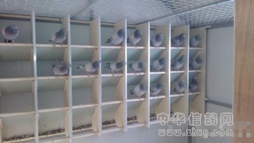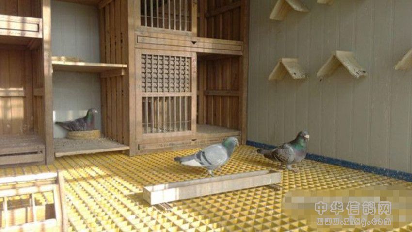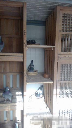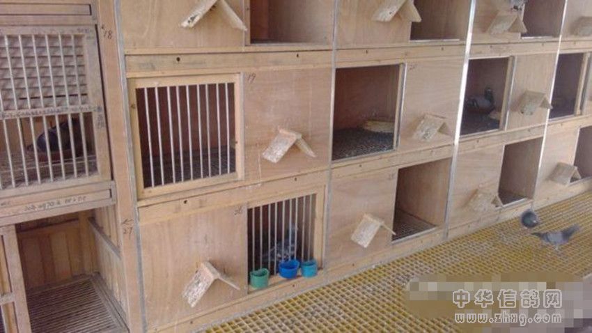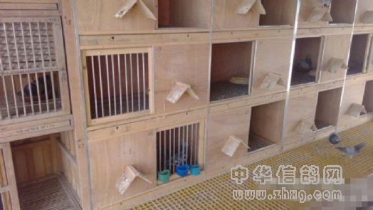 两个种鸽棚里,东西两面都是这种规格的巢箱,巢箱设计宽敞,并且开口上下错开,方便种鸽认家。为了增加对空间的有效利用,在每个巢箱外面都安装一个栖架,栖架装好后,还得防止站上架的鸽子与上面、左面或右面的鸽子发生争斗,位置可得选好。