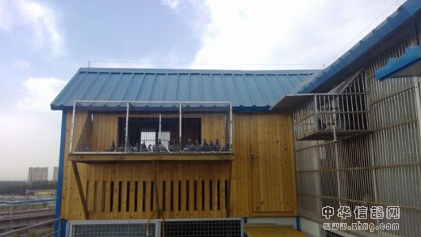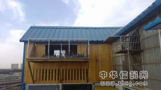 飞棚的设计相当讲究,前脸木结构,下面有活动的百叶窗,需要通风时打开,需要避光时关上。同时,起降平台设计得相当宽敞,在幼鸽开家前,方便幼鸽蹲房认家,比赛归来时也方便赛鸽顺利降落。为了教乖幼鸽,防止幼鸽养成乱落的习惯,在飞棚的棚顶拉上一圈铁丝,防止小鸽站在房顶不下来,使鸽子养成落平台的习惯,这对比赛进棚是相当有利的。开家前,幼鸽在起降台上认家。