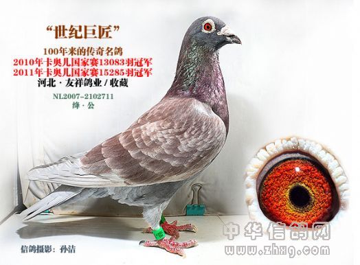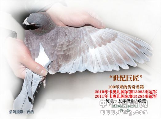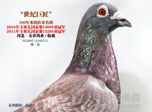 “世纪巨匠” 该羽传奇名鸽在第二次入赏国家赛冠军确认后不到一小时,金字塔鸽舍 黄先生就快速把此鸽导入,2012年年底河北廊坊友祥鸽业王成建先生经过努力再次将此鸽收藏入舍—进入河北友祥鸽业种鸽舍。