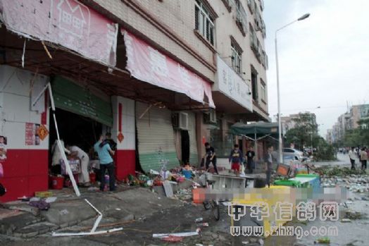 街市,镇区中心广场碗口粗的树木有的被拦腰截断,有的连根拔起。沿街部分商铺的货品被折断的树冠砸坏。